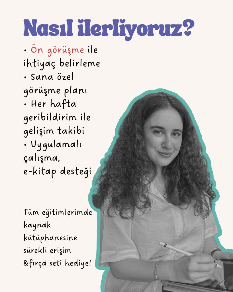 Bu formu doldurduktan sonra en geç 1 hafta içinde size e-mail üzerinden ulaşacağım. Başvuru sırasına göre dönüş sağlıyorum. Eğitim planı hakkında detayları yazılı olarak iletiyorum. Küçük yaş gruplarında ön görüşme yapmadan kayıt işlemini tamamlamıyoruz.