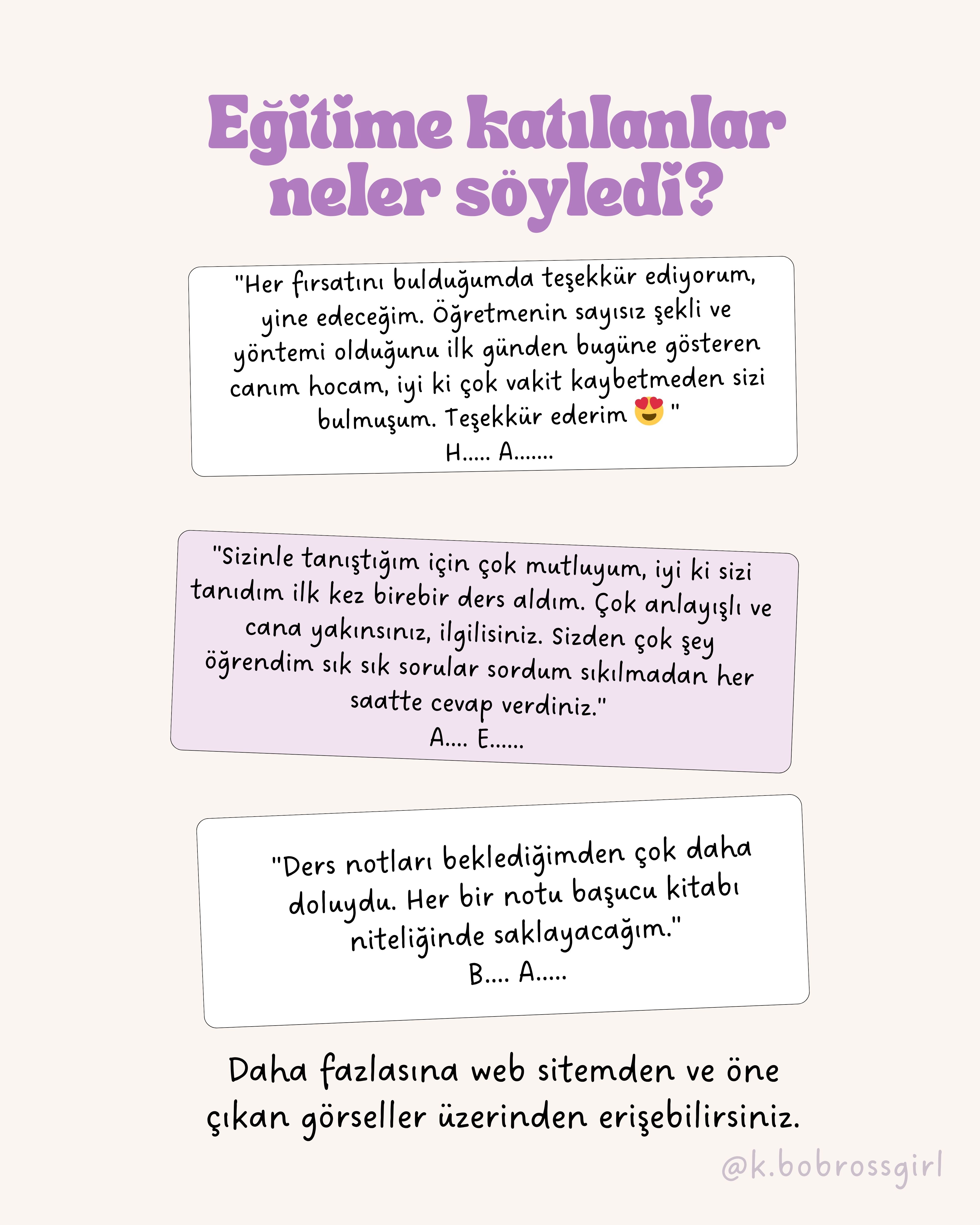 “Sizinle tanıştığım için çok mutluyum, iyi ki sizi tanıdım ilk kez birebir ders aldım. Çok anlayışlı ve cana yakınsınız, ilgilisiniz. Sizden çok şey öğrendim sık sık sorular sordum sıkılmadan her saatte cevap verdiniz.”
